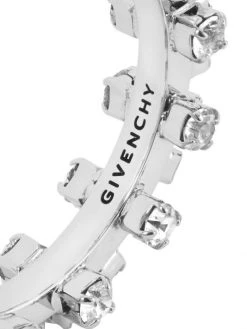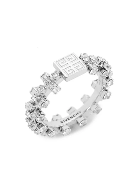 This silvertone ring features Swarovski crystals and a 4 G metal piece on the front.