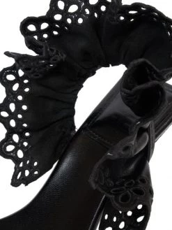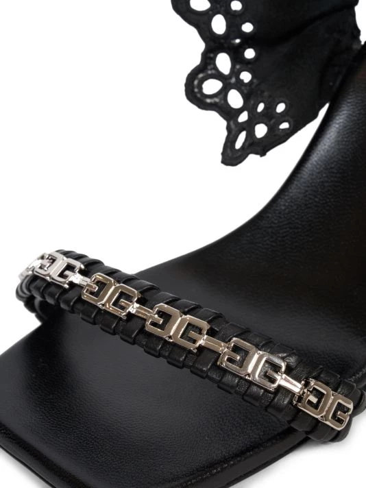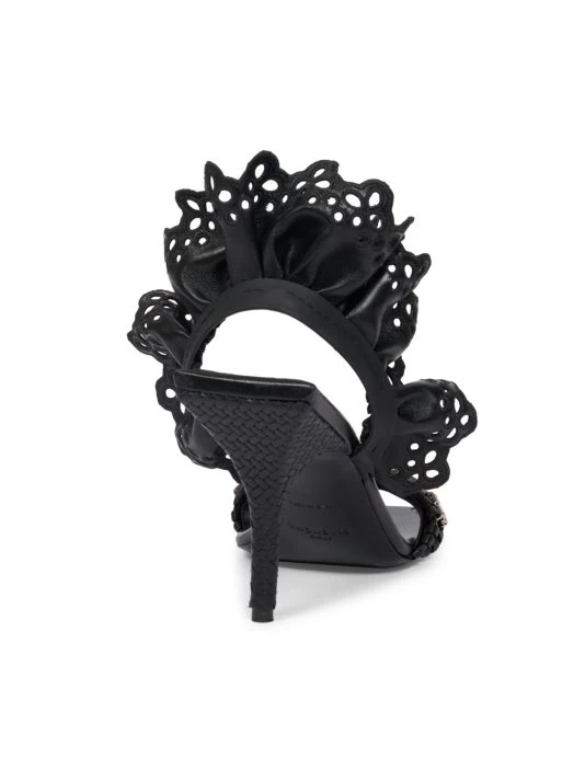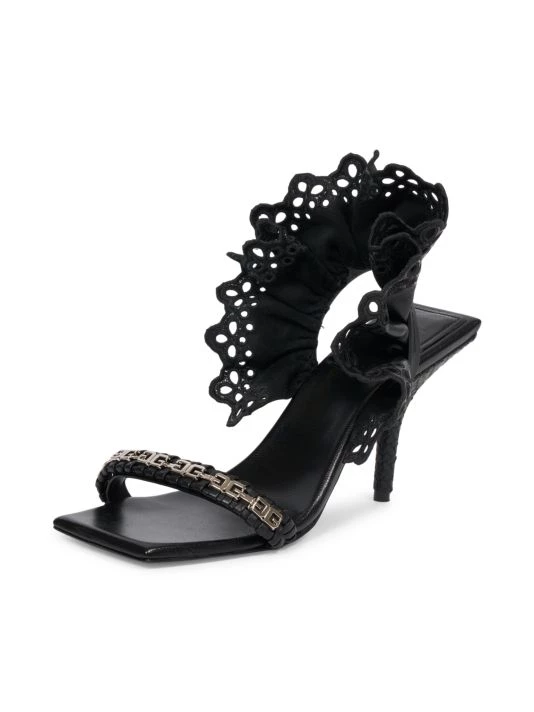 A logo chain tops the strap of these sleek slingback sandals, designed with a dramatic eyelet ruffle strap around the ankle.