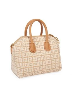Givenchy’s Antigona mini bag is crafted of 4G monogram-printed straw with goldtone hardware and contrasting trim.