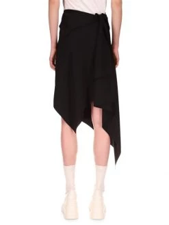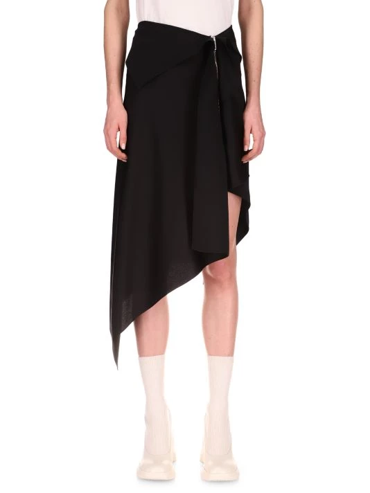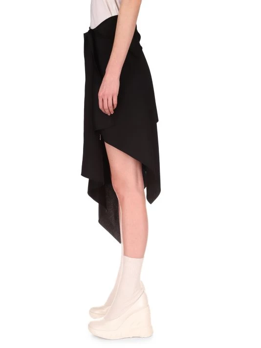Asymmetrical high-low skirt with a foldover front and gathered ruffle detailing at back.