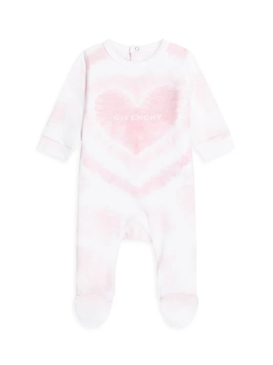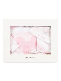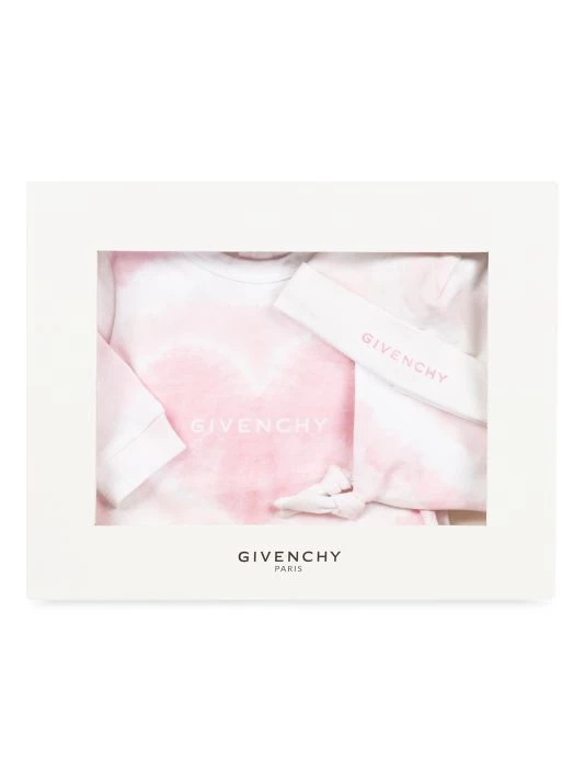 This three-piece set includes footed pajamas, a matching hat, and a soft toy all featuring a tie-dye heart design with the Givenchy printed logo. Sold in Givenchy gift box. Machine wash. Made in Portugal.