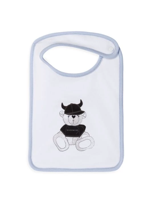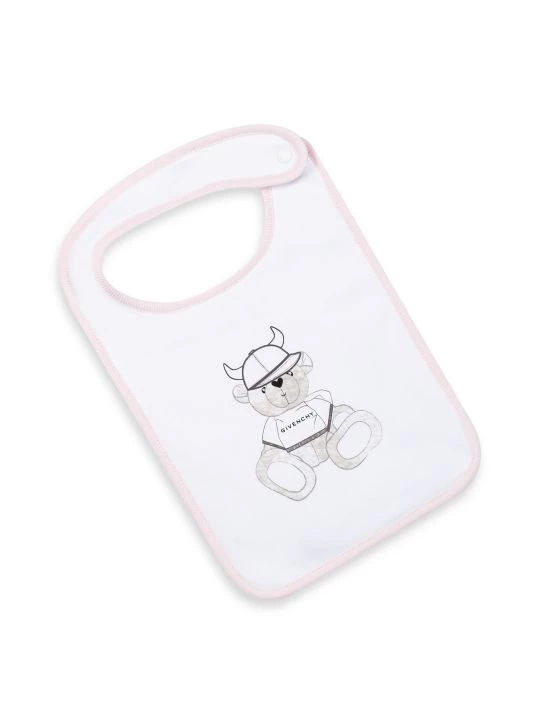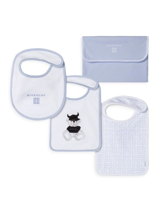 This set of three jersey bibs feature one with 4 G print all over and the other two with a teddy print and 4 G Givenchy printed logo on the plain bibs.