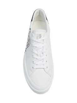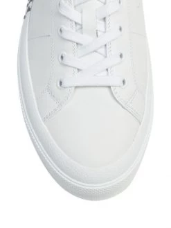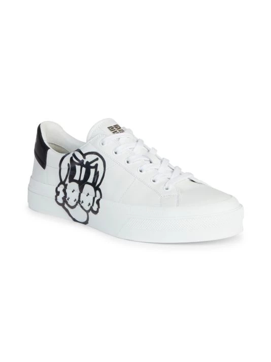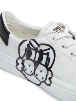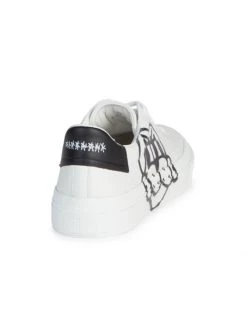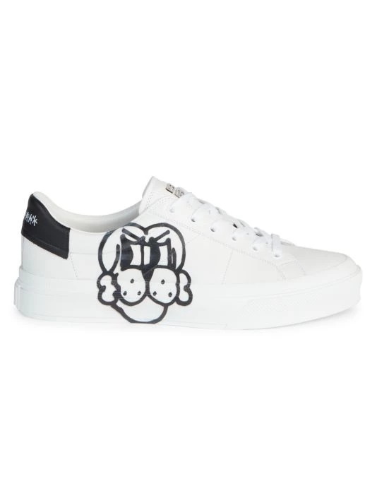 These leather sneakers feature a metal logo plaque at the tongue and a graffiti-style dog print at the quarter.