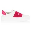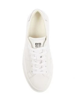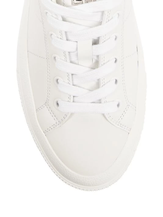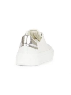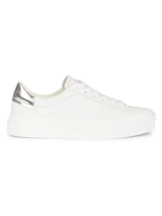 These sporty lace-up sneakers are crafted of soft Italian leather, adorned with a metallic panel at the back.