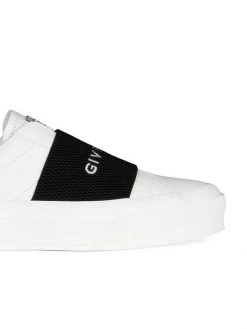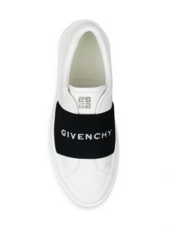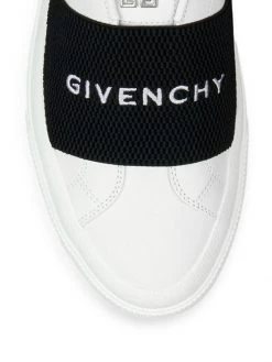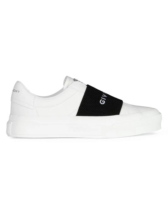An elasticized logo strap lends graphic dimension to these minimalist leather sneakers.