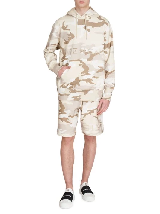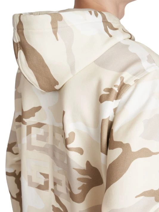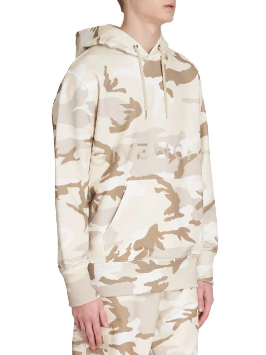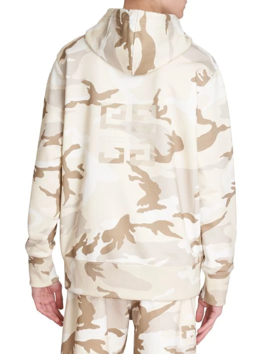 This Givenchy hoodie features a light camo pattern with logo layered over the front facing pockets.