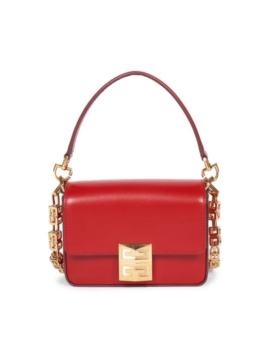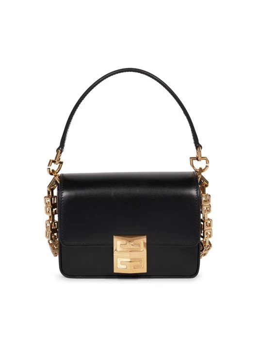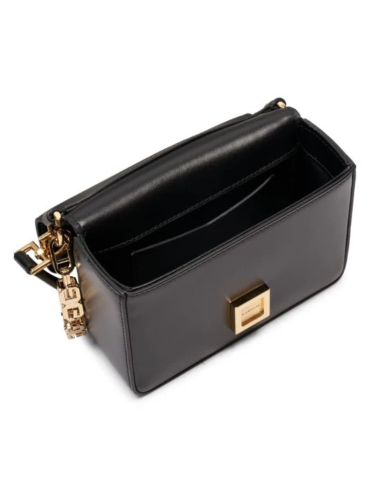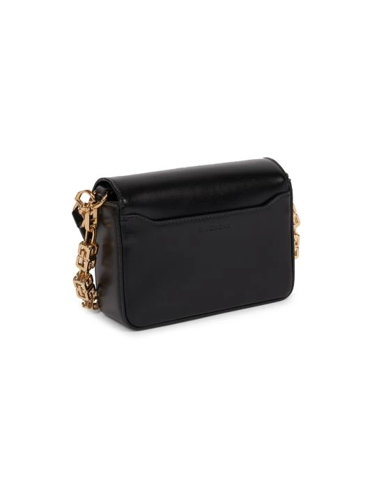 A custom logo-crafted cube-shaped chain embellishes this small leather crossbody bag.