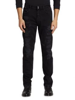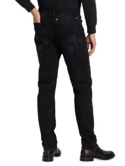 These edgy cotton-stretch jeans have statement distressing down the slim-cut legs.