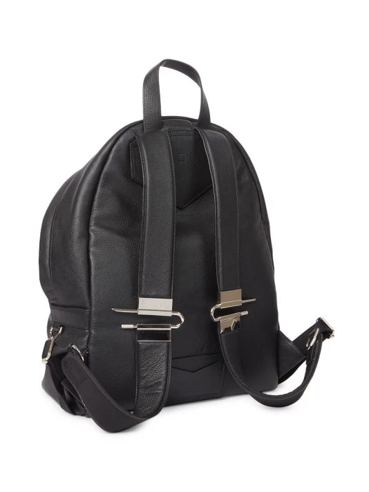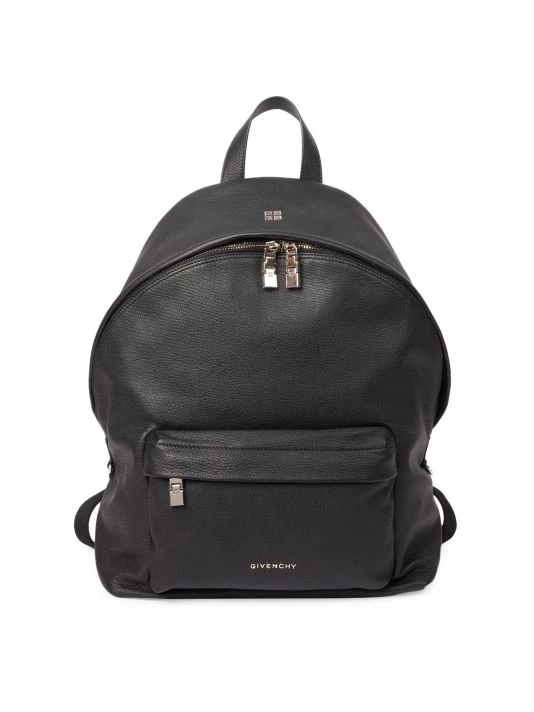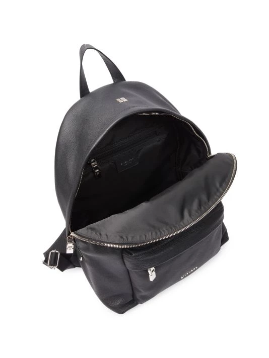 Sleek Italian goat leather backpack with an exterior pouch pocket.