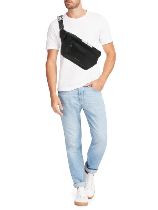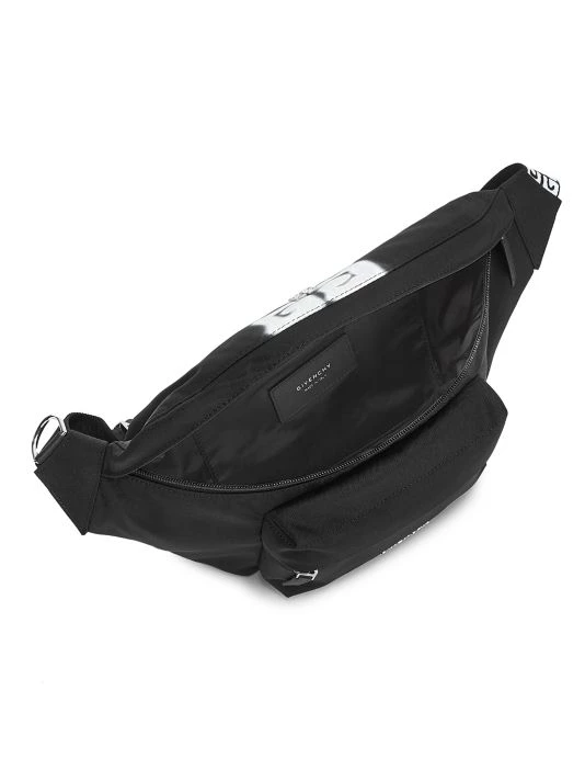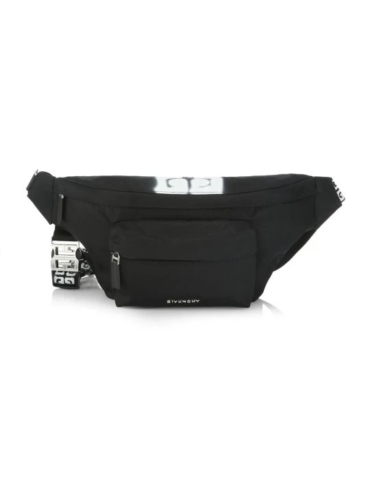 This belt bag by Givenchy is adorned with a spraypaint-inspired monogram logo and is finished with a signature logo on the exterior zipper pocket and metal monogram detailing on the adjustable strap.