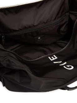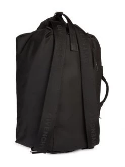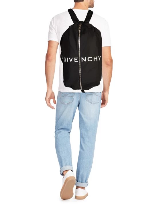 Givenchy’s nylon backpack sports a logo print at the front and a 4G zipper closure with logo accents. A handle strap at the side and adjustable back straps allow it to be carried over the shoulder or across the body.