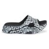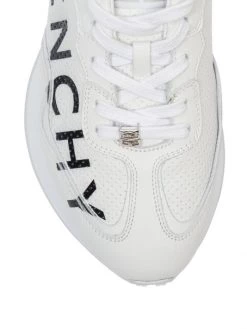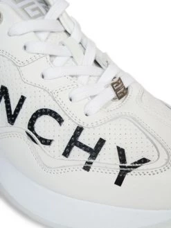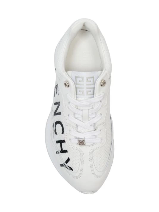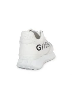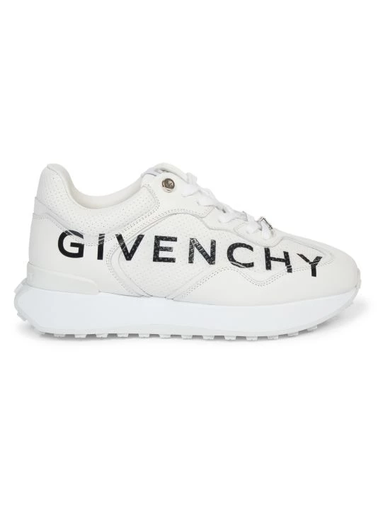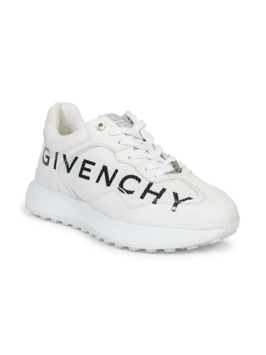 A graphic logo adorns the side of these pieced leather and mesh running-style sneakers.