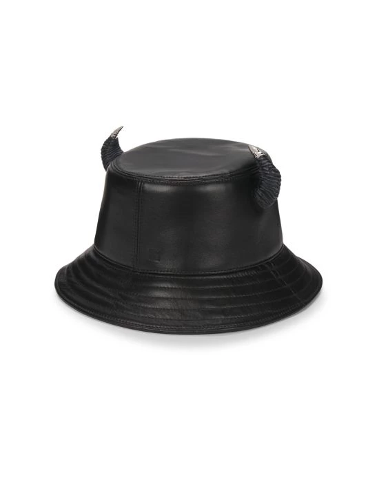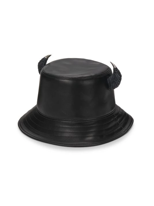 The devil is in the details with this sleek leather bucket hat featuring metal horn accents.