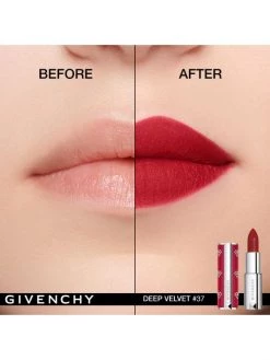 Apply Le Rouge Deep Velvet on lips starting from the center of the lips towards the corners, beginning with the upper lip. Continue application on the lower lip for a full Couture look.