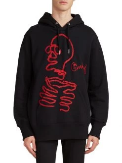 Creative Director Matthew Williams collaborated with Mexican artist Chito for Givenchy’s latest collection. With tough hardware and cartoonish designs, this line plays with the juxtaposition of delicate and strong motifs.Figurative skeloton and logo embroidery punctuate this cotton hoodie.