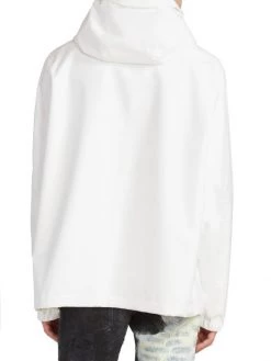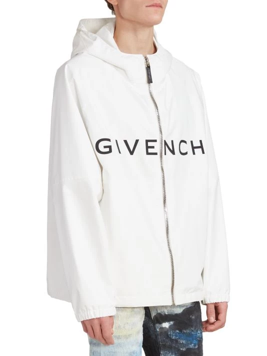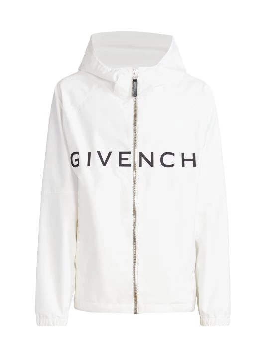 Crafted of polyamide, this jacket features a hood, fastens with a center zipper, and sports the brand name across the chest.