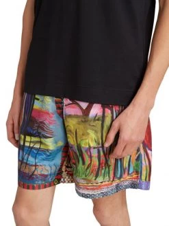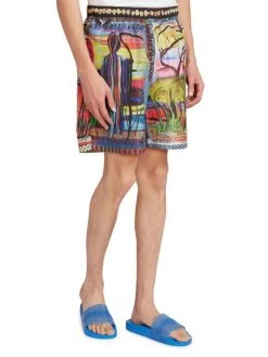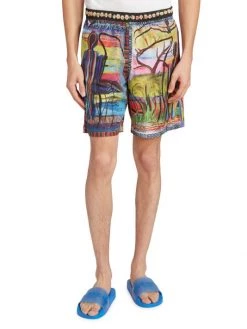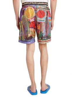 Made of polyester, these swim trunks feature an abstract pattern and an elastic waistband for a secure fit.