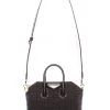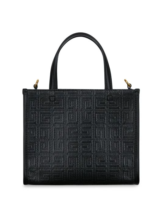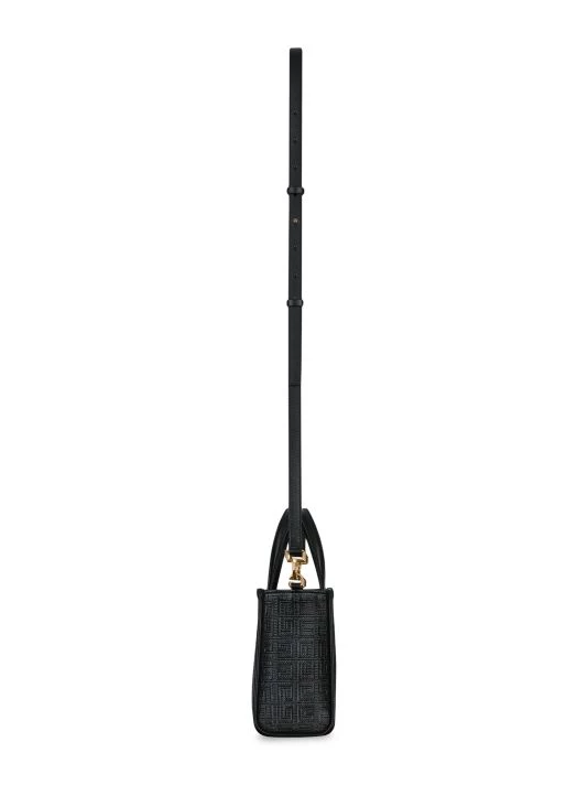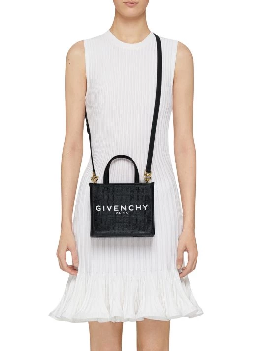 The Mini G Tote from Givenchy is crafted of 4G-embossed coated canvas with a printed brand signature at the front.
