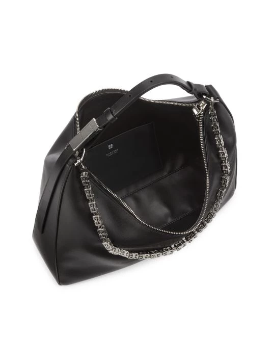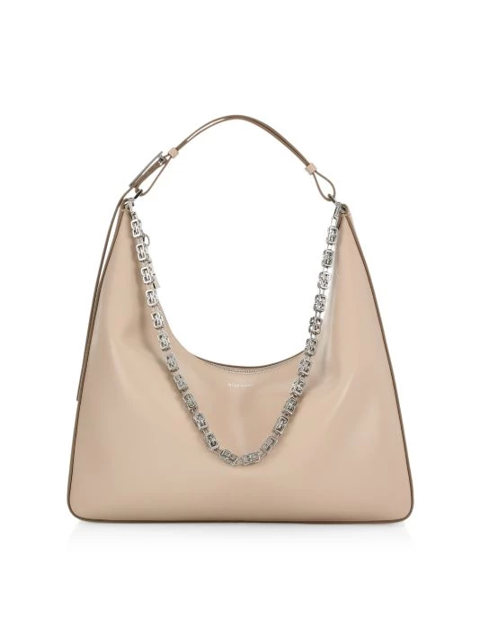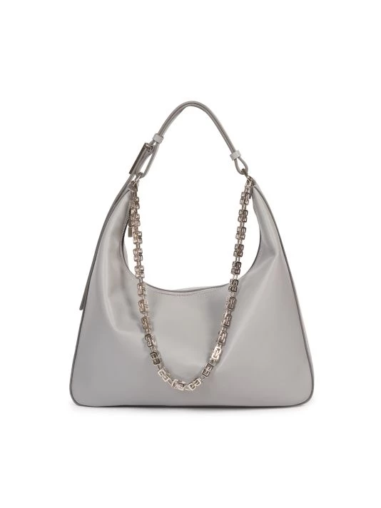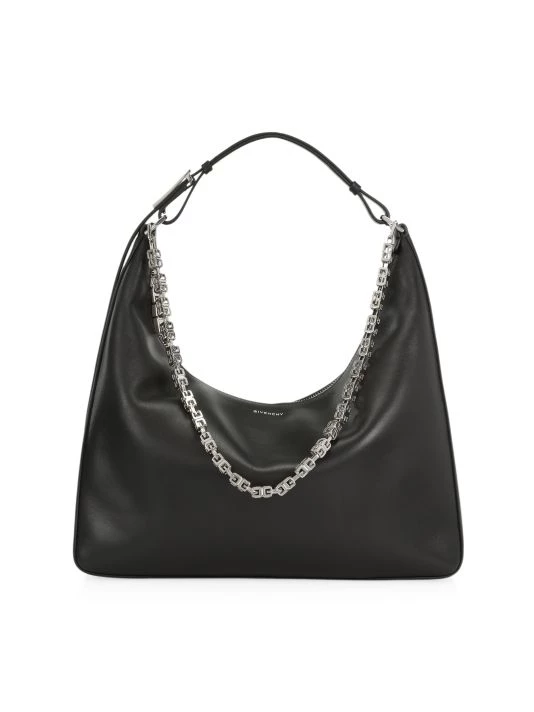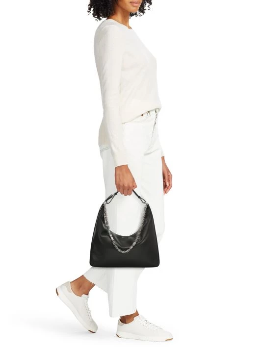 A cube-shaped logo chain strap adorns this sleek leather bag, crafted with a slouchy hobo silhouette.