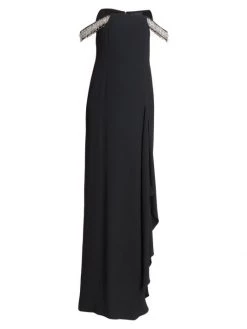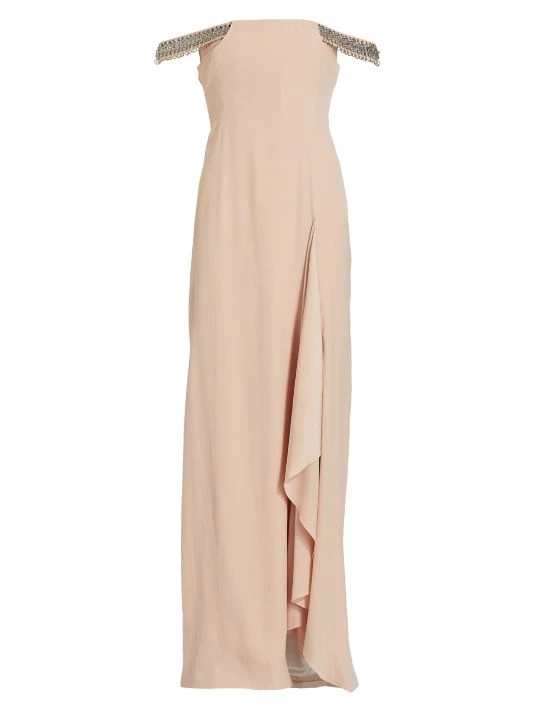 This off-the shoulder gown is detailed with chain and bead embellishments at the straps.