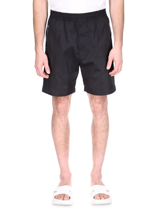 Lightweight shorts topped with an allover logo print, an elasticized waist and side zipper pockets.