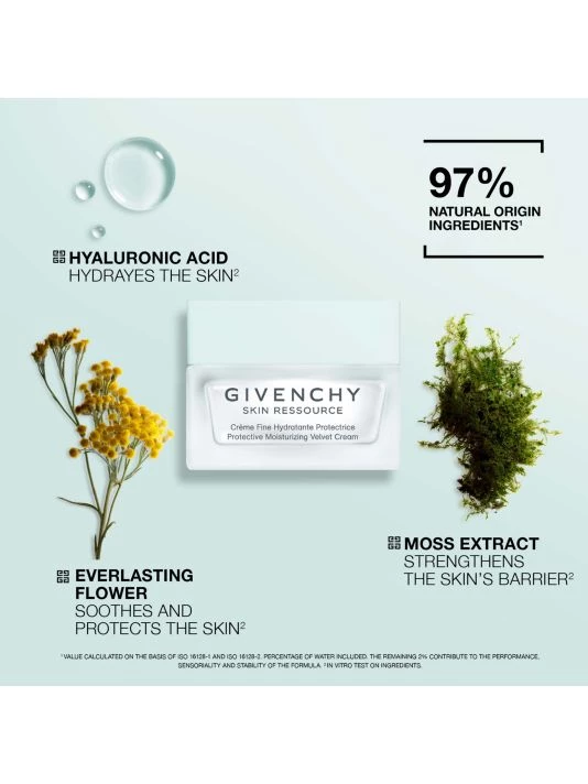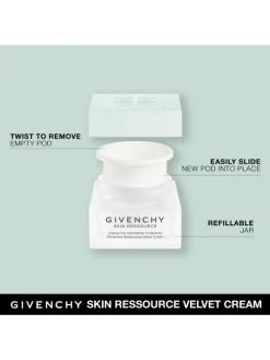 Velvet Moisturizing Face Cream Ressource is an anti-stress hydrating skincare line from Givenchy that replenishes the skin with moisture while protecting it from daily stresses of pollution, harmful infrared, and blue lights, hormonal stress, and lack of sleep. 1.7 oz. Made in France.
