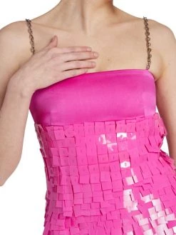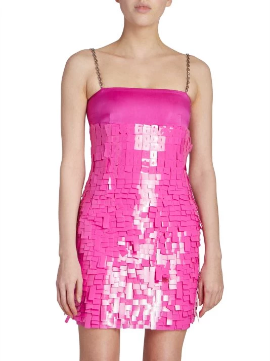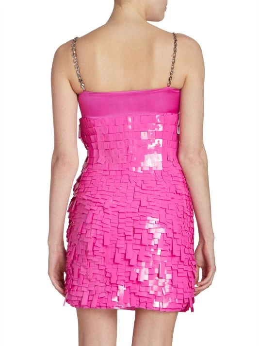 This dazzling minidress is adorned with squared sequins throughout the design, detailed with chain straps at the shoulders.