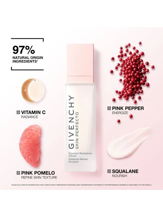 With Vitamin C, French Pink Pomelo, and Wild Pink Peppercorn, the skin Perfecto Radiance Reviver Emulsion improves the absorption of actives within the skin, contains fatty acids, and increases cell energy for improved cell renewal and healthy-looking skin.