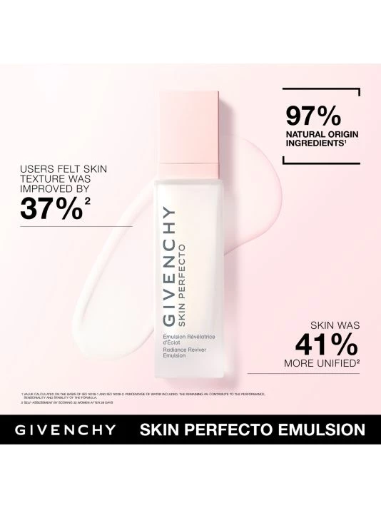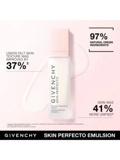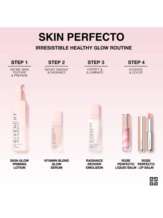 Quickly warm two pumps of the emulsion between your palms. Place your hands in front of your face and inhale the energizing Skin Perfecto fragrance. Using your palms, apply the emulsion over the entire face from the center outwards, starting at the chin and moving upward. Boost circulation and reveal an instant glow by gently patting using upward movements. Repeat the process with a light pinching motion, from the jawline up to the cheekbones and brow bones. For the ultimate radiant finishing touch, apply a coat of Rose Perfecto Lip Balm.