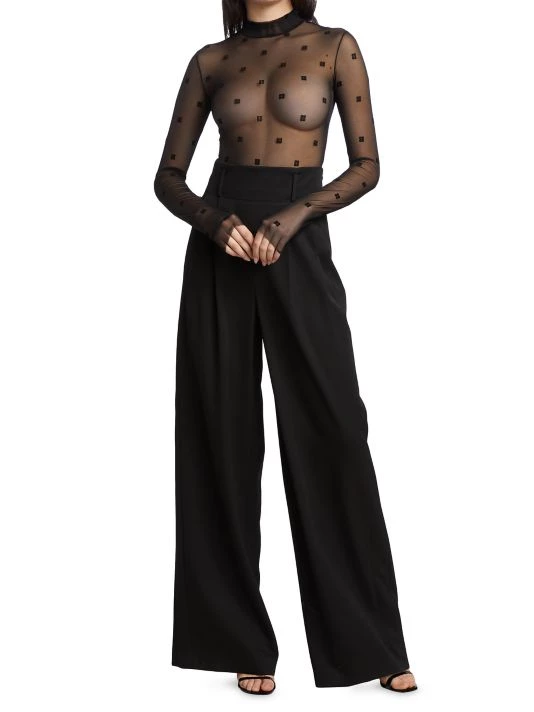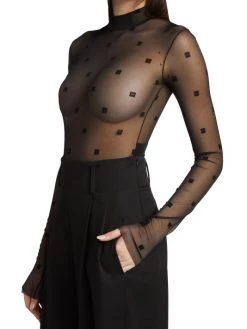 This sleek sheer bodysuit is adorned with a jacquard logo pattern, cut with a chic mock neck.