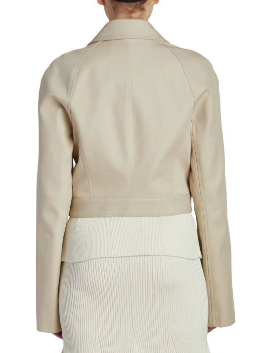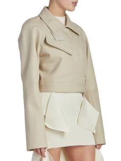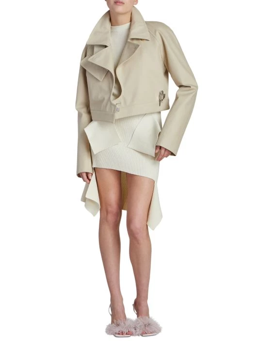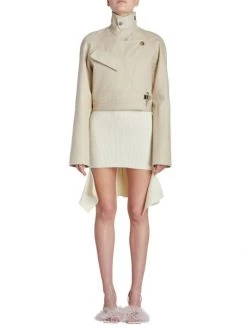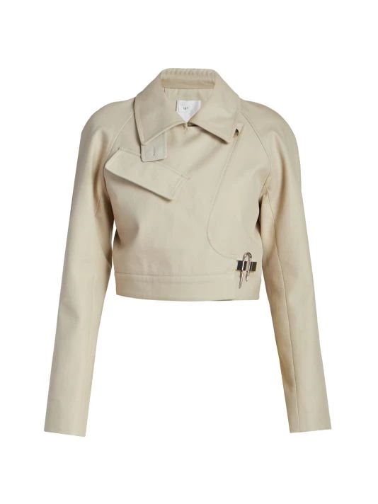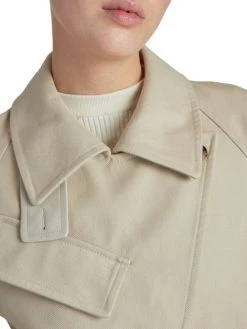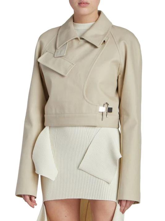 This unique jacket from Givenchy presents trench-inspired designs with a convertible collar and asymmetric closure, adorned with a V-lock mechanism.