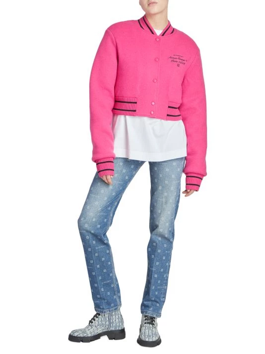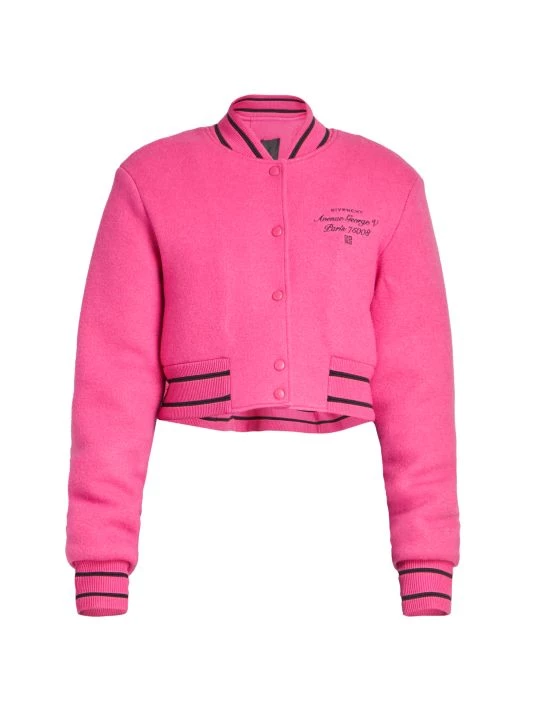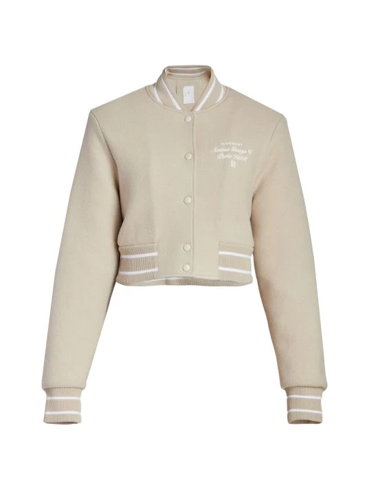 Composed of wool, Givenchy’s chic cropped varsity bomber jacket is accented with a striped rib-knit shawl collar, cuffs, and hem.